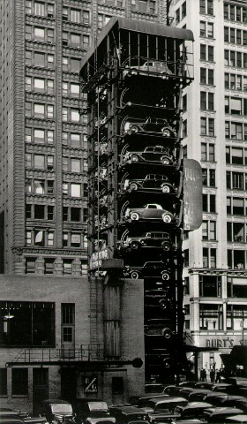 عکس «گاراژ آسانسوری با پارکینگ» توسط هنرمند جان گاتمن در سال ۱۹۳۶ در شیکاگو گرفته شده است.